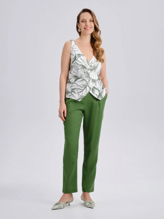 Женская блуза-топ без рукавов с выразительным растительным принтом — лёгкое и эффектное решение для тёплого сезона. Модель выполнена из приятной к телу ткани с добавлением льна, что обеспечивает комфорт даже в жаркую погоду. Асимметричный запах на передней части формирует аккуратный V-образный вырез, визуально вытягивая линию шеи и подчёркивая зону декольте. Глубокий вырез на спинке добавляет образу изящности и мягкой женственности.