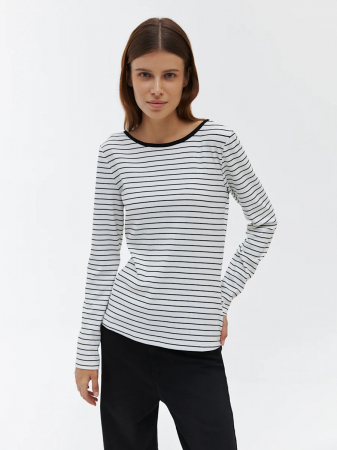 Женский лонгслив в полоску выполнен из мягкого трикотажа с добавлением вискозы и эластана, что делает его комфортным для повседневной носки. Молочный фон с тонкой черной горизонтальной полоской создает классический образ в стиле casual. Прямой крой и округлый вырез гармонично дополняются черной окантовкой горловины, а длинные рукава подчеркивают лаконичность модели.