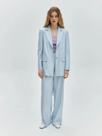 Брюки из костюмной ткани с добавлением вискозы в жемчужно-голубом цвете станут отличной основой делового образа, которая подчеркнет безупречный вкус и чувство стиля. Модель свободного фасона, расклешенная от бедра, мягко скрывает лишние объёмы, формирует гармоничный силуэт. Завершит образ с брюками удлиненный жакет из той же коллекции.