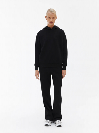 Тренд последних сезонов - свободные трикотажные брюки в спортивном стиле. Данная модель обладает отличительной особенностью в виде простроченных вертикальных стрелок. Спереди имеются вместительные карманы, а широкий пояс с резинкой дополнительно снабжен потайным шнурком для регулирования размера под себя. Универсальный черный цвет позволяет интегрировать брюки в любой гардероб и стилизовать с элементами верха как в базовых, так и в ярких оттенках.