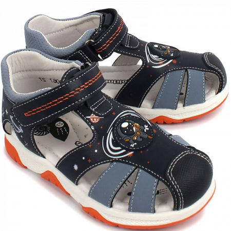 Модель выполнена из экокожи синего цвета и удобно фиксируется на липучку. Кожаная подкладка и стелька подарят комфорт детским ножкам во время носки.