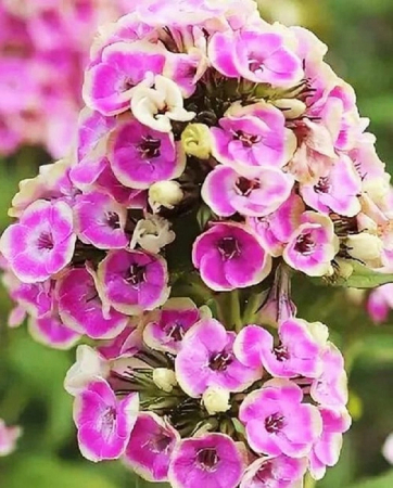 Необычный пестрый сорт. Цветки ярко-розовые с зеленой и желтой каймой. Метелки крупные, до 17 см. Цветение очень продолжительное. Высота 75 см.