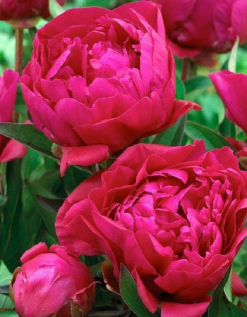 Пион Карл Розенфельд- травянистый и молочноцветковый.Цветок растет крепким, раскидистым кустом, высотой до 100 см. Побеги толстые, крепкие с ажурными и гладкими листьями оливкового оттенка. Бутон пышный, ярко-розовый, а к осеннему сезону появляется рубиновый оттенок.