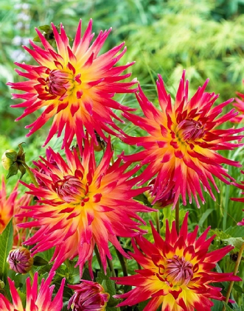 Георгина Бора Бора – клубневое растение высотой 90см. Кактусовидные желтые с красными кончиками цветки достигают 15-20см в диаметре и служат замечательным украшением участка.