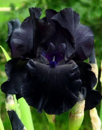Ирис Блэк Найт – корневищное растение высотой 70-80см. Мечевидные листья с восковым налетом собраны в вееровидные пучки. Цветки черные с фиолетовым отливом, размером 10-15см, источают сладковатый тонкий аромат. Цветет с мая по июнь. Используется для всех типов ландшафтного дизайна (украшение клумб, бордюров, рабаток). Прекрасно смотрится в срезке.