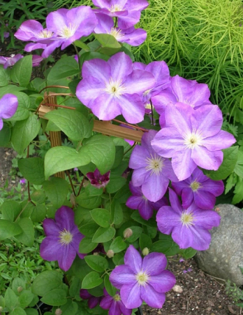 Эта лиана любит солнце, но при этом ей обязательно нужна прочная опора. Она боится сквозняков и холодных ветров. Почвы клематис любит плодородные, богатые органикой, легкие, нейтральные (рН 6,5 – 7,0) и хорошо проницаемые. На дно обязательно укладывают дренаж толщиной 15 см из битого кирпича (или гравия), перемешанного с песком. При посадке корневую шейку растений заглубляют в почву на 6 – 8 см, чтобы у него быстро образовывались придаточные корни и новые побеги. Грунтовые воды не должны близко подходить к поверхности земли, иначе глубокая корневая система клематиса может начать гнить, и тогда растение погибнет. Поэтому поливать нужно часто и обильно, но при этом следить, чтобы земля вокруг была только влажной и рыхлой.
