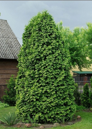 Туя с густой конической или широкостолбчатой формой кроны с закруглённой верхушкой. Растёт медленно, достигая высоты 5 м и ширины 2 м, к 10-ти годам высота 1,5 м, ширина 0,7 м. Прирост – 15 см в год. Веточки короткие, расположены вееровидно. Хвоя чешуйчатая, весной ярко-жёлтая, летом и осенью желтоватая,зимой приобретает бронзовый оттенок.
