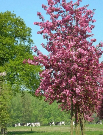 Дерево, во взрослом состоянии составляющее от 4 до 6 м в высоту, с вертикально растущей кроной диаметром до 6 м. Листья овальные, зеленого цвета, иногда оттеняют пурпурным. В момент распускания красные. По краям мелкие зубчики. В мае начинается обильное цветение дерева. Оно покрывается мелкими простыми цветочками с пятью лепестками. Они розовые или малиновые, более темные с обратной стороны.