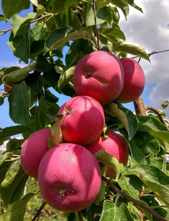 Зимостойкий сорт. Яблоки настолько яркие, насыщенно пурпурно-красные, что даже мякоть у них розового цвета. Заготовки из них получаются просто фантастические, а в свежем виде плоды едят до января