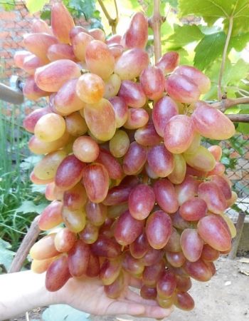 Грозди конические или бесформенные, средней плотности, иногда рыхлые, массой 700-1500 г. Ягоды удлиненно-овальные, очень крупные, средней массой 13,9 г, розовые, гармоничного вкуса. Мякоть сочно-мясистая, кожица средней толщины. Сахаристость сока ягод 17-19 г/100 см3, кислотность 6-7 г/дм3.