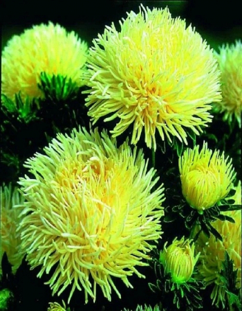 Богатое соцветие. Изысканный куст эффектной букетной формы, узкий, прочный, с крупными махровыми цветками, высотой 50-60 см. Соцветия коготковые, желтой окраски, диаметром 10-12 см. Предпочитает солнечные места. Цветет обильно с августа по сентябрь. Отличаются великолепными срезочными свойствами, до двух недель стоят в воде, сохраняя декоративность. Прекрасно подойдут для оформления цветников и рабаток.