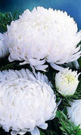 Длительное,обильное цветение.Серия роскошных гигантских астр. Привлекательный обильно цветущий куст с многочисленными соцветиями высотой до 100 см. Соцветия густомахровые, белоснежные, диаметром 12-14 см, до 12 штук на растении. Растение предпочитает открытые солнечные места. Цветет обильно с июля по октябрь. Отличаются высокой устойчивостью к болезням и неблагоприятным погодным условиям, великолепными срезочными свойствами, до двух недель стоят в воде, сохраняя декоративность. Прекрасно подойдут для оформления цветников и рабаток.