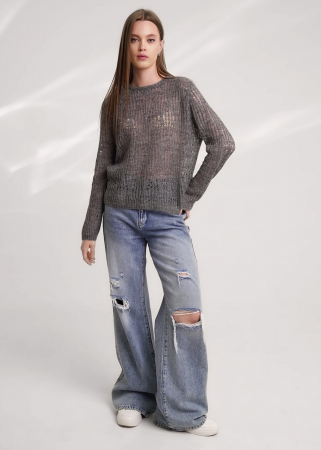 Вязаный джемпер из акриловой пряжи, переплетения ажур на основе глади. Длинный втачной рукав. Округлая горловина с бейкой. По низу изделия, рукавов манжеты.