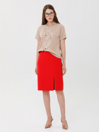 Модель прямого силуэта, слегка зауженная к низу, на подкладе. Перед ассиметричный, рельеф слева заканчивается высоким разрезом. Сзади в среднем шве обработана потайная застёжка молния. Пояс притачной, со шлёвками. Ремень в комплект не входит.