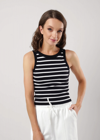Майка для дома и отдыха из хлопкового трикотажного полотна с эластаном - кашкорсе. Умеренный объем. Средняя ширина бретели, округлая горловина. По горловине и пройме окантовка. Вшивка в боковом шве.