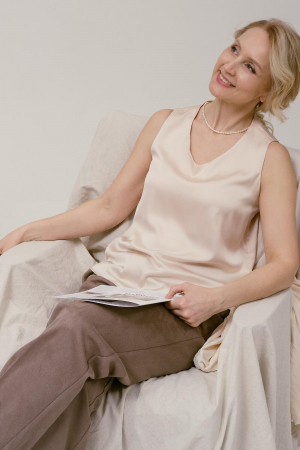 Свободная удлиненная майка из струящейся ткани не облегает фигуру, позволяя материалу струиться вокруг тела. Неглубокий V-образный вырез деликатно приоткрывает зону декольте. Переход длины по низу изделия добавляет ему динамики.