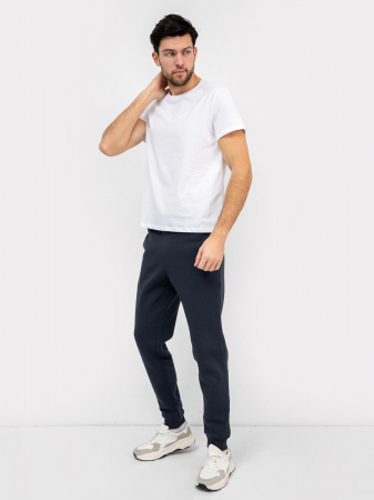 Стильные брюки из трикотажного футера с теплым подчесом. Силуэт зауженный, штанины с манжетами. Есть удобные боковые карманы. В поясе – эластичная тесьма и шнурок-затяжка. Просто, комфортно, актуально!