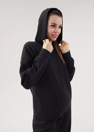 Куртка спортивная из трикотажного полотна,на молнии.По горловине капюшон со шнуром,Спущенная линия плеча,длинный рукав,внизу принт.По низу рукава,изделия манжет из кашкорсе.По переду и рукаву отстроченные резы,карманы в шве.На полочке гофропринт,нашивка