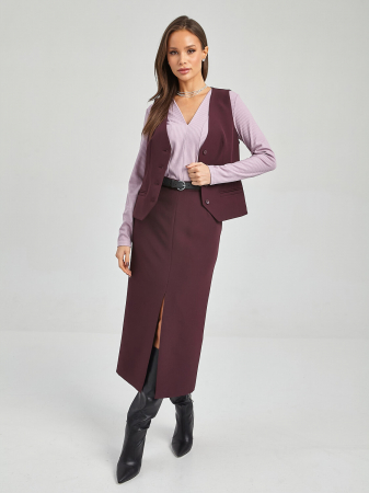 Модель с рельефами. Спинка со средним швом. Спереди прорезные карманы в рамку и застёжка на петли и пуговицы. Край борта фигурный.