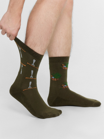 Яркие мужские носки классической длины с теплой махровой стопой. Забавный рисунок и слова "накормить" и "обогреть" – забавно и стильно! Состав: 2% эластан / 33% ПА / 65% хлопок.