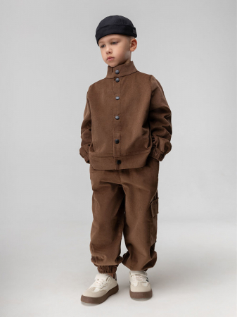 Костюм вельветовый: рубашка и брюки. Прямая рубашка без подкладки на кнопках, с воротником стойка, длинные рукава на резинке. Свободные брюки, пояс с резинкой, по низу брюки на резинки. Брюки с карманами двух типов: классические боковые и один накладной.