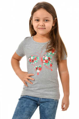 Футболка детская полуприлегающего силуэта длинной чуть ниже уровня бёдер из трикотажного полотна «кулирка с лайкрой». Рукав втачной базового покроя, короткий. Вырез горловины О- образный. На полочке присутствует печатный рисунок.