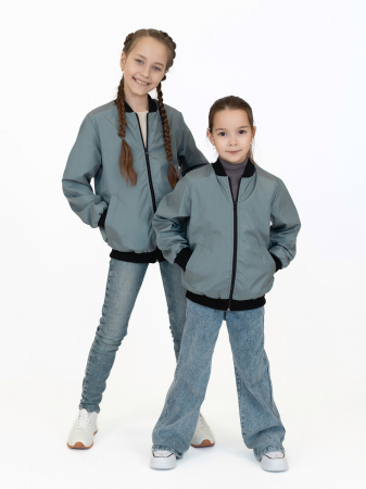 Детская ветровка бомбер из ткани однотонного цвета светло-серого цвета для девочки и мальчика. Застегивается на молнию. По бокам карманы с листочкой по диагонали. Мягкий воротничок-стоечка, низ рукавов и бомбера отделаны трикотажной манжетой.