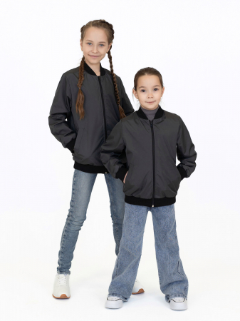 Детская ветровка бомбер из ткани однотонного цвета темно-серого цвета для девочки и мальчика. Застегивается на молнию. По бокам карманы с листочкой по диагонали. Мягкий воротничок-стоечка, низ рукавов и бомбера отделаны трикотажной манжетой.