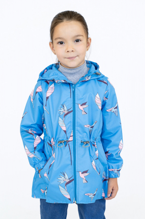 Детская ветровка из мембраны синего цвета с принтом птичка для девочек. По талии скрытая кулиска со шнуром резинкой и фиксаторами. По краю рукавов манжеты с широкой резинкой. По бокам два диагональных кармана обработанные листочкой.