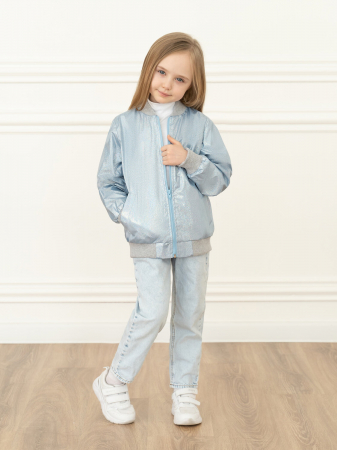 Детская ветровка бомбер из ткани однотонного цвета голубого цвета с голографическим эффектом для девочки. Застегивается на молнию. По бокам карманы с листочкой по диагонали. Мягкий воротничок-стоечка, низ рукавов и бомбера отделаны трикотажной манжетой.
