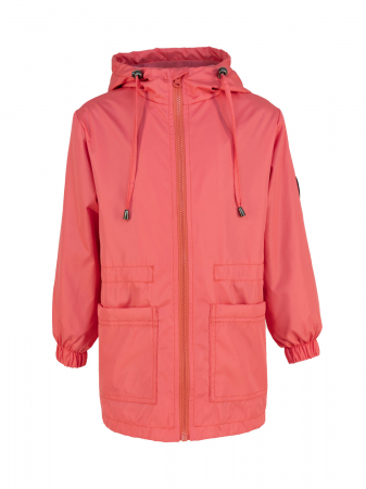 Детская ветровка свободного кроя на флисе для весны и лета кораллового цвета. Флисовая подкладка по всему изделию: в рукавах, и капюшоне. Застегивается на молнию. Высокий воротник, клапан для защиты от бегунка, внутренняя ветрозащитная планка. По талии кулиска для регулирования объема, фиксатор расположен на спине. Капюшон объемный, регулируется шнурком с фиксаторами. На рукаве светоотражающая нашивка, по низу резинка.