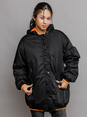 Бомбер Смэш черный удлиненный для девочки имеет свободный крой со спущенной линией плеча, что придает ему трендовый вид, а также обеспечивает свободу движения и комфорт. Бомбер можно сочетать с любой одеждй, сохраняя при этом стиль и удобство. Выполнен из плотной ткани с водоотталкивающей пропиткой. Капюшон съемный на молнии и регулировкой по лицевому краю. На левом рукаве съемный объемный карман, декорированный светоотражающим оригинальным термотрансфером.