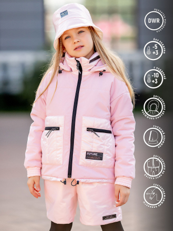 Куртка для девочки Вера демисезонная розовая с утеплителем. Материал с ветро- и водоотталкивающим покрытием. Украшена нашивками с надписями. Съемный капюшон регулируется с помощью шнурка-кулиски со стопперами. Центральная застежка на молнию с защитой подбородка.