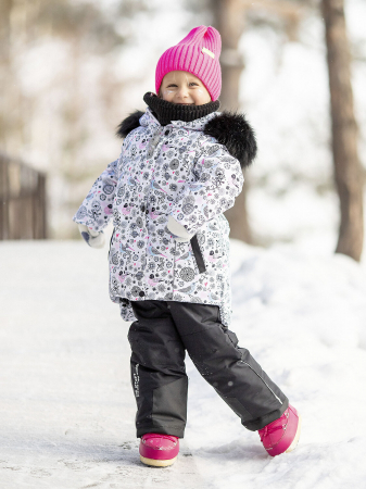 Комплект для девочки зимний утепленный Мэри. Куртка с нежным принтом на белом фоне и черный полукомбинезон. Удлиненная куртка комфортной посадки с разноуровневым низом и внутренней регулировкой по талии и новая конструкция полукомбинезона с трикотажными вставками. В комплекте применена концепция колорблокинга. Листочки карманов имеют отделку в цвет полукомбинезона. Капюшон с козырьком, скрывающим кнопки. Декор термотрансфером по спинке. Брюки идут на резинке без молнии (ширинки).
