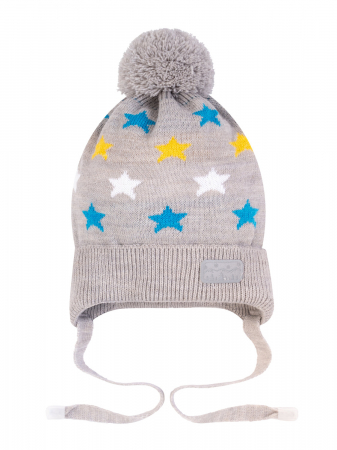 Детская вязаная однотонная шапка с отворотом, связанным узором резинкой. Такой эластичный узор дает плотную посадку по голове, не дает шапке сползать со лба. Для вязания была использована теплая, мягкая пряжа, в составе которой 30% мериноса и 70% акрила. На отвороте есть цельные небольшие ушки с завязками. Шапка однотонная с узором разноцветные звезды. На макушке большой помпон. Спереди небольшая светоотражающая нашивка. Такая шапочка понравится детям. Можно составить комплект со снудом из нашего каталога.