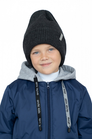 Детская шапка двухслойная с отворотом. Связана эластичным узором резинка из плотной, мягкой акриловой пряжи с мериносом (30%). Двухслойность и отворот делают шапку достаточно объемной, но она смотрится аккуратно. Подходит для осени и зимы. Спереди небольшая брендированная светоотражающая нашивка. Шапка выполнена в приятном цвете антрацит, который легко сочетать с другими предметами гардероба.