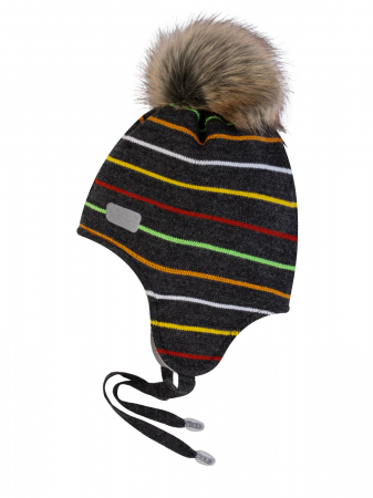 Детская зимняя шапка для мальчиков и девочек с удлиненными ушками и завязками. Однотонная шапка с рисунком разноцветные полоски. Состав верха шапки - 30 % меринос, 70% акрил. Легкая, дышащая, простая в уходе пряжа. Тонкий утеплитель 60 гр. Подкладка из флиса, защищает от холода и ветра. На макушке – большой помпон из искусственного меха. Спереди небольшая нашивка.