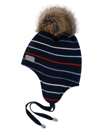 Детская зимняя шапка для мальчиков и девочек с удлиненными ушками и завязками. Однотонная шапка с рисунком разноцветные полоски. Состав верха шапки - 30 % меринос, 70% акрил. Легкая, дышащая, простая в уходе пряжа. Тонкий утеплитель 60 гр. Подкладка из флиса, защищает от холода и ветра. На макушке – большой помпон из искусственного меха. Спереди небольшая нашивка.