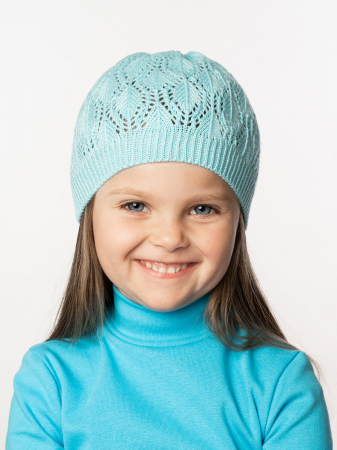 Вязаная шапочка ажурная для девочки из легкого невесомого акрила. Ажурный узор идеально подходит для летнего периода. По низу для лучшей посадки по голове эластичная вязка узором резинка. Шапочка выполнена в однотонном цвете.