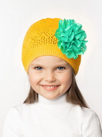 Легкая вязаная шапочка для девочки однотонного цвета на лето. Сделана из легкого акрила воздушным ажурным узором. Сбоку большой фактурный цветок контрастного цвета.