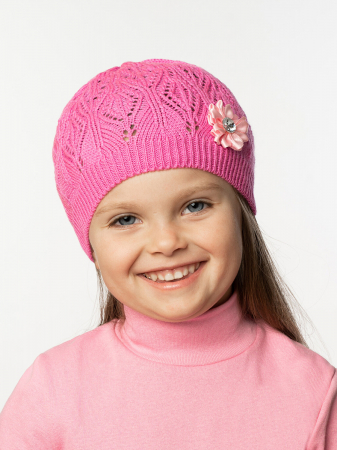 Детская вязаная шапочка для девочки однотонного цвета. Связана из акрила нежным ажурным узором веточка. Сбоку объемная аппликация в виде небольшого бантика или цветочка. По краю шапочки эластичная двойная вязка. Такая шапочка хорошо дополнит образ малышки.