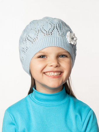 Детская вязаная шапочка для девочки однотонного цвета. Связана из акрила нежным ажурным узором веточка. Сбоку объемная аппликация в виде небольшого бантика или цветочка. По краю шапочки эластичная двойная вязка. Такая шапочка хорошо дополнит образ малышки.