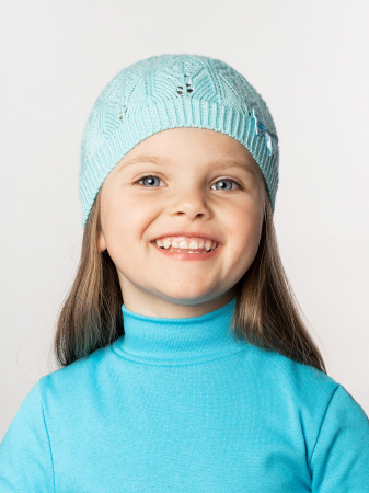 Детская вязаная шапочка для девочки однотонного цвета. Связана из акрила нежным ажурным узором веточка. Сбоку объемная аппликация в виде небольшого бантика или цветочка. По краю шапочки эластичная двойная вязка. Такая шапочка хорошо дополнит образ малышки.