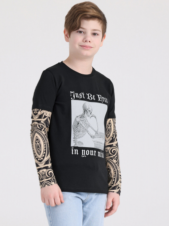 Стильный лонгслив для мальчика выполнен из кулира - тонкого хлопкового полотна с лайкрой. Изделие прямого покроя с округлым вырезом горловины и ярким принтом. Длинные рукава с эффектом 2в1 украшенные набивкой в виде татуировок не оставят равнодушными ни одного мальчишку! Уход: только машинная стирка (руками не стирать!) при температуре 40 градусов, без предварительного замачивания. Изделия с печатью и декором перед стиркой необходимо вывернуть на изнаночную сторону.