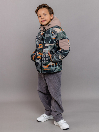 Куртка для мальчика Говард с принтом милитари выполнена из мембраны. Объёмная куртка со спущенной линией проймы. В локтевой шов заложена вытачка, повторяющая изгиб руки для комфорта движения. На капюшоне, по талии и низу куртки регулировки объема. Светоотражающие элементы: кант в капюшоне, локтевых швах рукавов, нашивки на капюшоне и правой полочке, патч и навес на молниях.