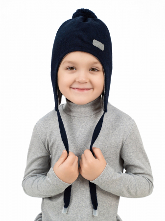 Назначение: детская демисезонная шапка для мальчиков и девочек. Свойства ткани: мягкая, прочная и тёплая пряжа. Приятный к телу, нежный на ощупь хлопковый подклад. Особенности модели: детская шапка. Шапка фиксируется завязками. Завязки с фиксаторами на концах. Выпускается в однотонном темно-синем цвете, украшена помпоном и декоративной нашивкой.