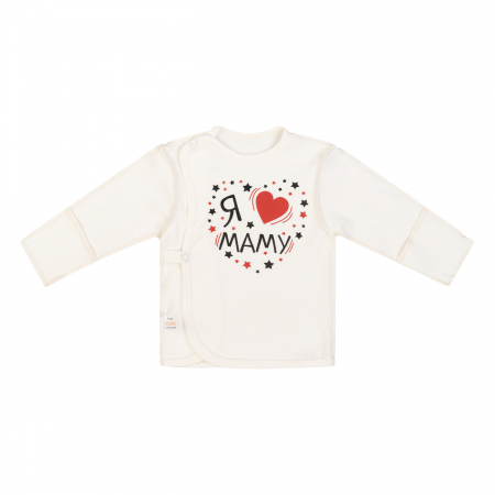 Назначение: детский трикотаж; для повседневной носки; одежда для дома; одежда для новорождённых; распашонка для детей грудного возраста. Свойства ткани: Плотный, эластичный, приятный к телу, «дышащий» трикотаж. Особенности модели: Ясельная хлопковая кофточка-распашонка с длинными рукавами. Сшита швами наружу из плотной, край обработан эластичной бейкой. Рукава с клапанами для закрытого или открытого положения рук. Клёпки-застёжки спереди. Выпускается в однотонном молочном цвете, спереди принт «Мама я люблю тебя».
