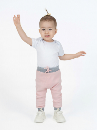 Детские штанишки для малышей из мягкого трикотажного полотна пудрового цвета. Крой: свободный. Пояс мягкий эластичный серого цвета с широкой резинкой. Дополнительно есть завязочки для лучшей посадки. По низу штанин эластичные манжеты также контрастного цвета.