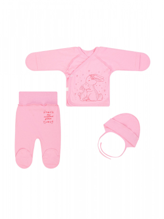 Комплект для новорожденных из нежного трикотажа (хлопок). Состоит из трех предметов: распашонки, ползунков и чепчика. Распашонка на запАх с удобной застежкой на кнопку сбоку, спереди лаконичный милый рисунок. Рукава длинные со специальным клапаном для закрытия маленьких ручек. Края обработаны трикотажной бейкой. Короткие ползунки с закрытыми ножками на широком эластичном поясе (еврорезинка), небольшой текстовый принт сверху. Чепчик с завязочками край обрамлен эластичными трикотажем. Комплект сшит из однотонного трикотажа швами наружу.