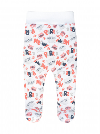 Ясельные ползуночки с закрытыми ножками из мягкой, нежной и дышащей набивной кулирки белого цвета с принтом Meow. Широкий эластичный пояс, не будет пережимать животик ребенка. Подходят для постоянной носки, хорошо переносят частые стирки.